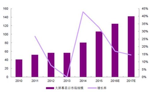 2014年中國LED顯示行業市場規模為302億元,2015年為310億元,2016年為335億元。